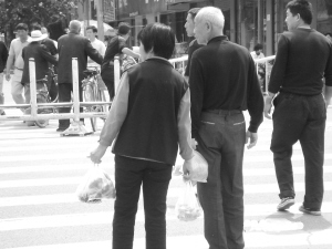 5月19日上午10∶30,市區八一路與育新街交叉口,兩位老人購物結束,手拎塑料袋,正在等候通過馬路。