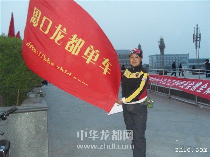 4月18日傍晚,一名網友把“周口龍都單車”旗幟插在五一廣場,為祈福活動布置場地。