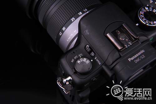 單反功能齊全的操控在G2上則可以全部看到,機身頂部除了測光與拍攝模式的波盤外,還可以看到3個撥桿:切換對焦與連拍速度的控制都和電源開關一樣被整合在了機身頂部,同時松下特有的智能模式iA也與錄制視頻被單獨作為按鍵羅列在的上,在狹小的機身頂部空間,眾多按鍵就這樣充實有序的安置其中,閃光燈,熱靴,甚至某些單反都不能做到如此之齊全。