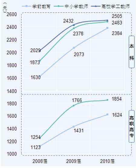 根據(jù)調查,2010屆大學畢業(yè)生從事學前、中小學及高校學工教師相關職業(yè)的畢業(yè)半年后月收入雖然仍低于全國平均水平(本科為2815元,高職高專為2142元),但和2009屆、2008屆相比呈現(xiàn)較明顯的上升趨勢。其中,本科畢業(yè)生從事學前教育職業(yè)的月收入漲幅比例要高于從事中小學和高校學工教師相關職業(yè)的漲幅比例,并且大學畢業(yè)生從事學前和中小學教師相關職業(yè)的月收入漲幅比例要高于全國平均水平。