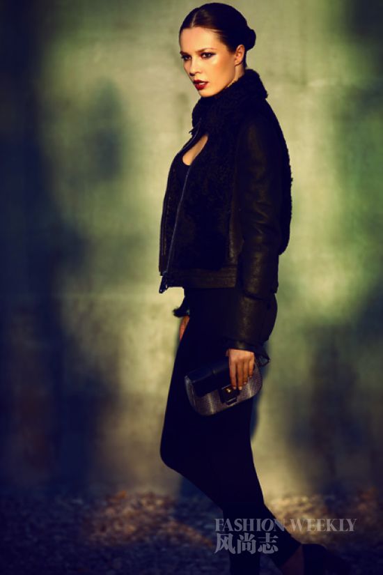 黑色翻毛皮夾克 黑白紋樣手包 All by Tod's