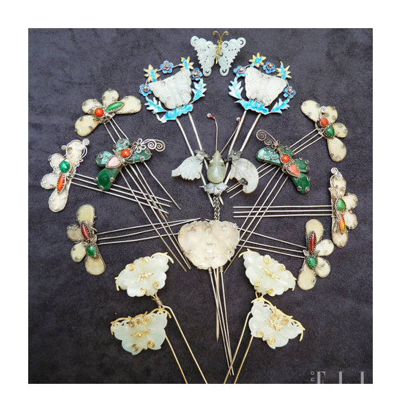 步步的頭飾品種很多,有渡金、銀、點翠、燒青、玉石、珍珠、花飾等等等,先介紹其中一部分點翠