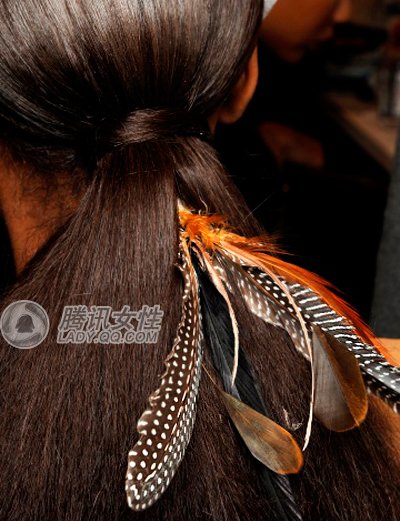 Gucci 2011秋冬秀場的馬尾發型獨樹一幟,用形似“毛刷”的蓬松低扎長馬尾搭配長長的裝飾羽毛,前衛而富有夸張的藝術效果,故意打造的干枯毛躁的馬尾造型與其精致入微的服裝形成對比,很有秋冬溫暖休閑的文藝氣系