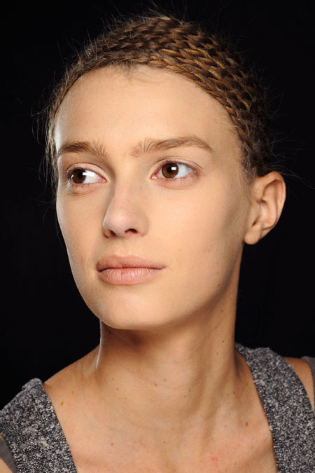 ??? 亞歷山大 麥昆 (Alexander McQueen) 2012春夏女裝秀場妝容淡雅簡單,仿若未經(jīng)雕琢過的素顏肌膚,彩妝師Peter Philips打造出質(zhì)感細膩的啞光肌膚和粉金色唇妝。發(fā)型方面,創(chuàng)意顧問Guido Palau挑戰(zhàn)了高難度螺旋式多層麻花辮造型。模特們的秀發(fā)由上至下被分成若干區(qū)域,逐一編成麻花辮,沿著頭部輪廓成螺旋形環(huán)繞,然后被包裹在由Guido Palau設(shè)計的34款黑色、白色、金色等不同色彩的蕾絲頭飾之下,與Alexander McQueen女裝中的不同服裝搭配,精致的花紋和奇特的造型吸引了全場的注意力