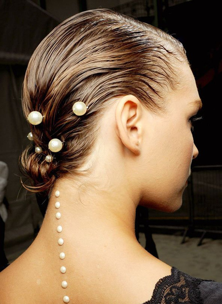 9、Chanel S/S 2012。模特的發(fā)髻上不僅有著濕發(fā)的感覺(jué),同時(shí)用幾顆珍珠加以裝飾,更加凸顯出奢華感