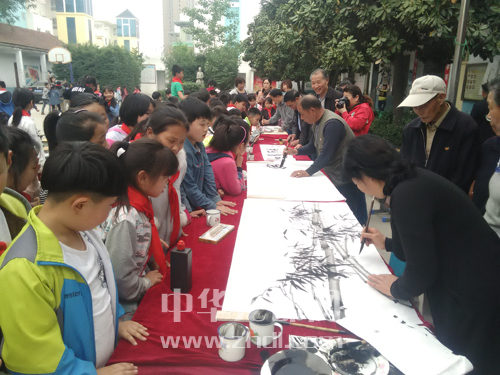 ????4月25日下午,市直老年書畫研究會的書畫愛好者走進市經濟開發區韓營小學,開展“書畫下基層”活動。十多位老年書畫愛好者在現場揮毫潑墨,即興創作,讓該校學生近距離感受傳統文化的魅力。晚報記者 張燕 攝