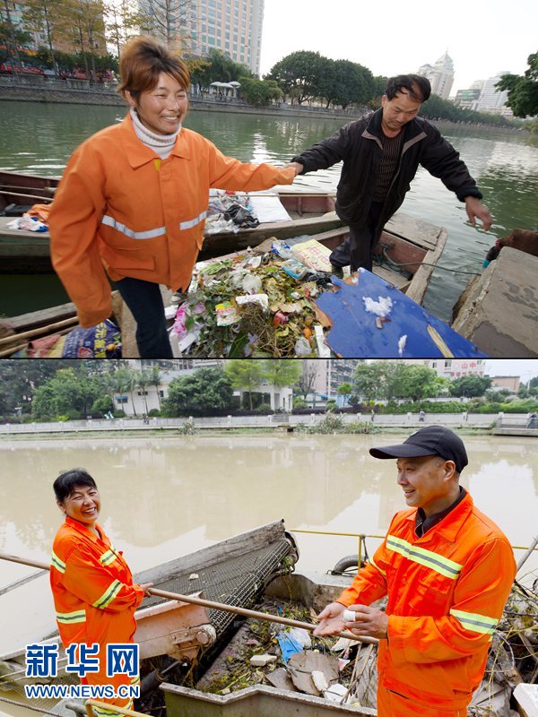 ????拼版照片,上圖:2008年3月12日,楊蘭芳(右)、羅祥英夫婦走過盛滿垃圾的環(huán)衛(wèi)小船。下圖:2016年4月25日,暴雨讓福州晉安河內(nèi)垃圾增多,手指受傷的楊蘭芳(右)仍然堅持陪伴在妻子羅祥英身旁,清理內(nèi)河垃圾。新華社記者 姜克紅 攝