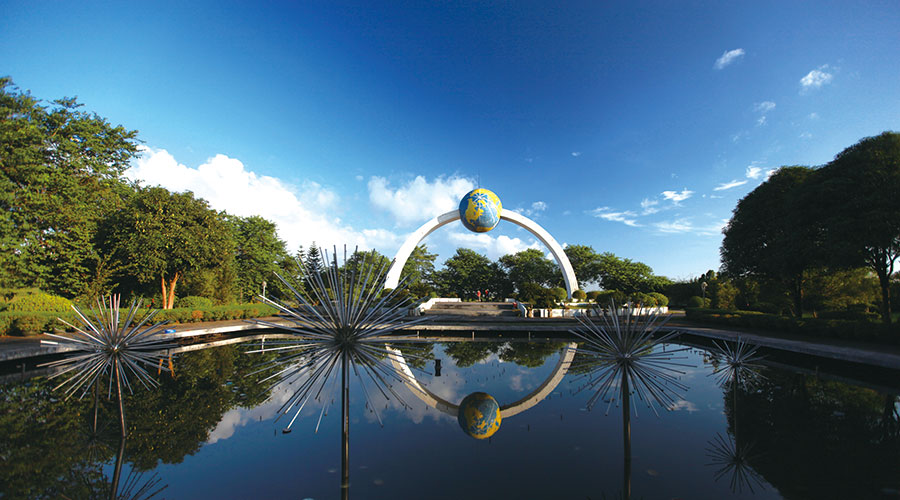 ????桂平北回歸線標志塔坐落在桂平市石咀鎮小汶村附近,是我國建設的第七座北回歸線標志塔。塔身高17.2米,跨度26米,形似一道彩虹,穿過一個直徑6米的地球,地球中間有一個直徑16厘米的小孔,名為“窺陽孔”。每年夏至的正午時分,陽光不偏不倚地穿過“窺陽孔”,直射到標志下方地面上的廣西壯族自治區地圖桂平點上,整個塔呈現神奇的“立竿無影”現象。這種神奇的現象也證實了桂平北回歸線塔建造的精準性,不過,錯過這一時刻,就要再等一年才能目睹這一奇景了。