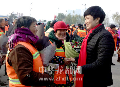 ????昨日上午,淮陽縣總工會廣場熱鬧非凡,愛心人士陳慧女士(右)向環衛工人捐贈了700套保暖用品。