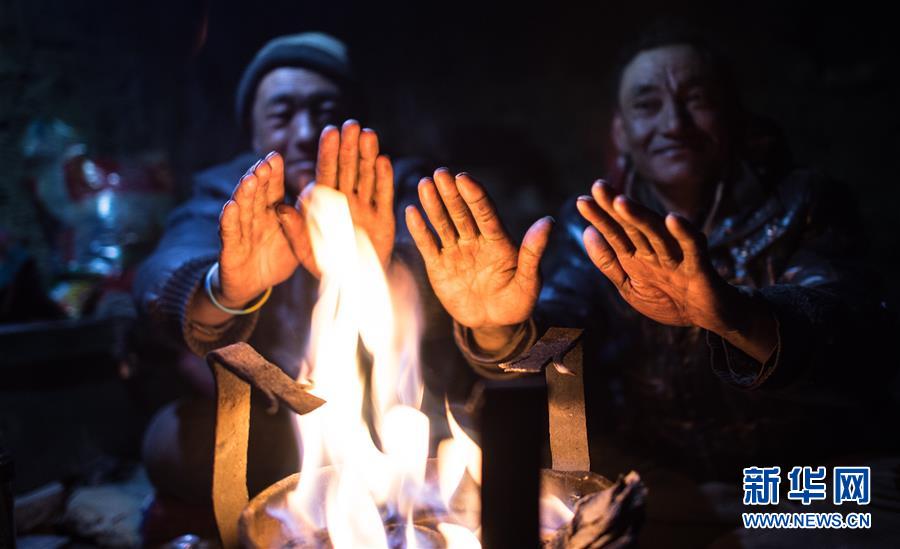 ????牧羊人在普姆雍措湖邊的放牧點(diǎn)烤火取暖。