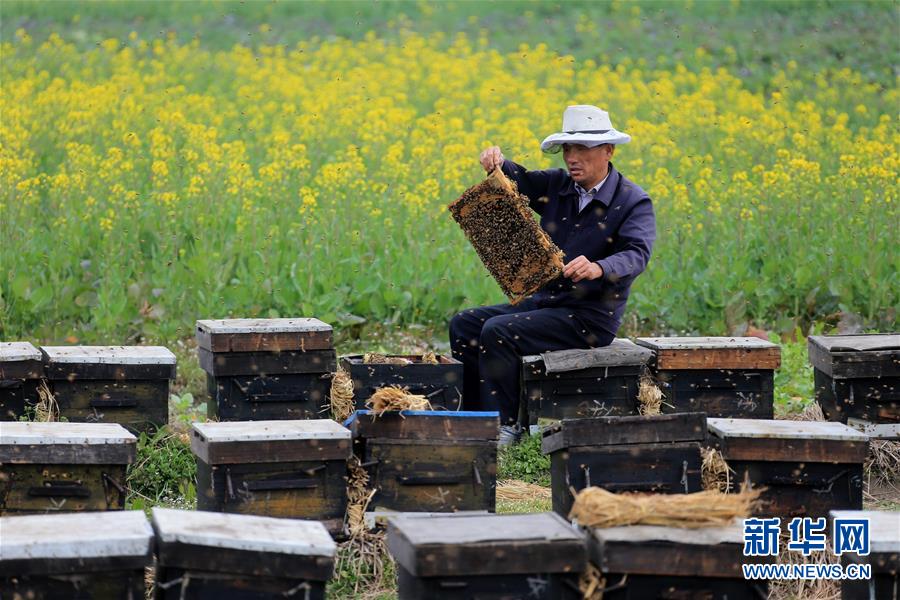 ????2月20日,安徽省黃山市萬安鎮蜂農在油菜花田里放蜂割蜜。