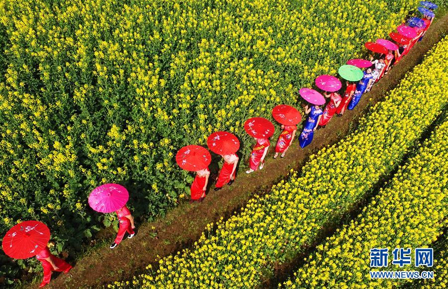 ????2月26日,在湖南省衡陽縣華山村,旗袍愛好者從油菜花海中穿過。南國春來早,從空中俯瞰,早春時節的南方大地色彩斑斕,處處流淌著春的氣息。 新華社發(曹正平 攝)