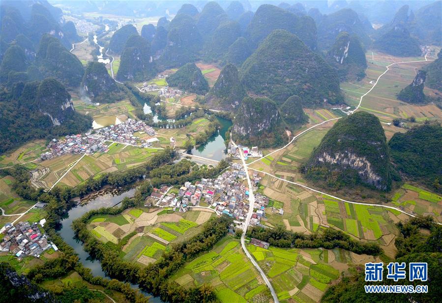 ????這是2月26日在廣西羅城仫佬族自治縣東安村航拍的田園春景。
