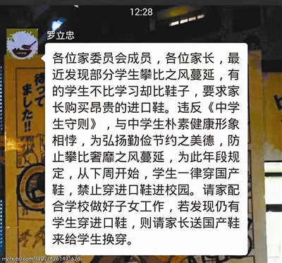近日,有網友在論壇發帖稱,福建晉江市子江中學規定稱,禁止學生穿進口鞋進校。昨天,該校政教處一名老師回應稱,網傳通知是該校個別班級的班主任上周發在班級微信群里的,不是學校的行為。學校只是提倡學生穿便宜一點,不要攀比,并未強制規定不能穿進口鞋。 根據網友貼出的微信截圖,一則面向家委會成員的通知顯示,因最近發現部分學生攀比之風蔓延,有的學生不比學習卻比鞋子,要求家長購買昂貴的進口鞋,為此年段規定,從下周開始,學生一律穿國產鞋,禁止穿進口鞋進校園。通知中還稱,若發現仍有學生穿進口鞋,則請家長送國產鞋來給學生換穿。 該通知遭曝光后,有不少網友評論稱,“不少耐克阿迪也是國產的啊,明明白白的made in China,難道也不讓穿嗎?” 也有網友指出,國產鞋未必比進口鞋便宜。據網友曬出的一款“李寧韋德之道四全明星限量版”淘寶銷售頁面截圖,這款鞋售價為人民幣13999元。 有網友認為,現在中學生攀比風氣過重,學校這一做法合理。也有人認為,“嚴禁攀比”的初衷是好的,但“禁止穿進口鞋”的方法不妥。有網友質疑,學校對教師和學生的標準不統一,“教師隊伍里身穿國外品牌的本身就不是少數,學校自身用的東西里不少都有國外的技術”。也有網友表示,孩子成績好,家長自掏腰包獎勵一雙鞋無可厚非,學校無權干涉。 昨天,北青報記者就此事聯系晉江市子江中學,一名政教處的老師表示,網傳通知是該校高中部某一年級個別班級的班主任發的,“這名老師上周發在班級微信群里的,不是學校的行為”。 “我們沒有強調一定是國產不能是進口,我們只是反對鋪張浪費,提倡勤儉節約,是讓大家低調一點,穿便宜一點,不要攀比”。這名老師稱,學校里很多孩子家庭條件不錯,平時確實存在攀比之風。平時學校要求學生統一穿著校服,但“有家長反應,學生間攀比鞋子現象嚴重。” 這名老師表示,目前,學校沒有相關規定強制禁止學生穿進口鞋,“該穿什么就穿什么,低調一點就行啦”。 據子江中學學校官網介紹,該校創辦于2001年秋,是晉江市首所社會力量創辦的全日制完全中學。2010年5月,該校曾榮獲“全國民辦先進學校”等稱號。 |