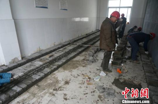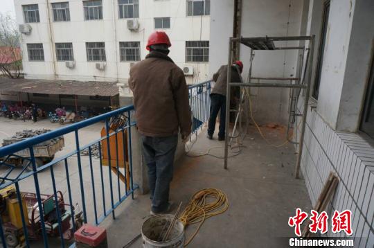 ????圖為23日上午,工人們正在對(duì)學(xué)校的廁所實(shí)施改造?!№n章云 攝