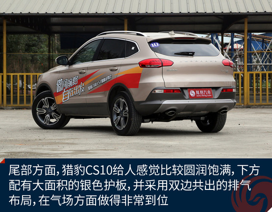 側面看過去,獵豹CS10采用一條剛勁十足的腰線從頭燈到尾燈,展現出了蓄勢待發的車身姿態,同時鍍鉻窗框亮條的使用讓該車看上去更加豪華大氣。尾部方面,獵豹CS10給人感覺比較圓潤飽滿,下方配有大面積的銀色護板,并采用雙邊共出的排氣布局,在氣場方面做得非常到位。