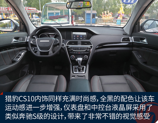 獵豹CS10內飾同樣充滿時尚感,全黑的配色讓CS10的運動感進一步增強,儀表盤和中控臺液晶屏采用了類似奔馳S級車型的貫通式設計,帶來了非常不錯的視覺感受。用料方面,中控臺上方面板為搪塑工藝,手感較軟,并且還進行了仿縫線處理,讓整個內飾看起來很有質感。