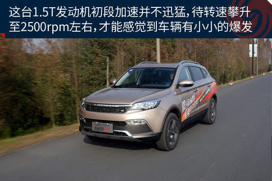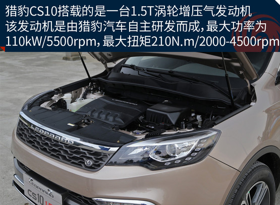 本次我們試駕的獵豹CS10搭載了一臺1.5T渦輪增壓氣發動機,最大功率為110kW/5500rpm,最大扭矩為210N.m/2000-4500rpm。傳動部分,與這臺發動機匹配的是5速手動與CVT無級變速箱,并采用前置前驅的驅動形式。