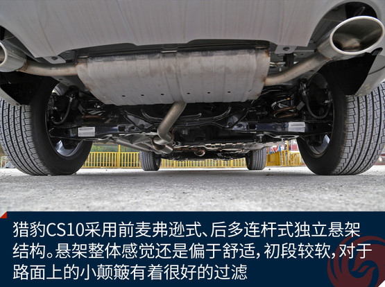 獵豹CS10采用前麥弗遜式、后多連桿式獨立懸架結構,相比同級別扭力梁車型多多少少提升了一定的操控感。懸架整體感覺還是偏于舒適,初段較軟,對于路面上的小顛簸有著很好的過濾,在彎中的支撐力也較有韌性,過彎時的側傾控制的比較不錯。