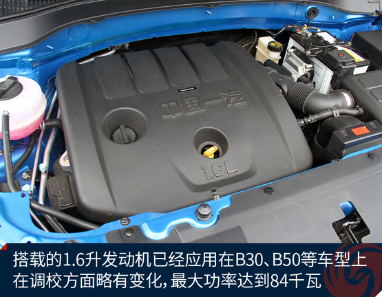奔騰X40搭載的是型號為CA4GB16的1.6升自然吸氣式發動機,這臺發動機在B30、B50等車型上已使用很久,只是性能調校上稍有不同。最大功率為84千瓦,峰值扭矩155牛米。