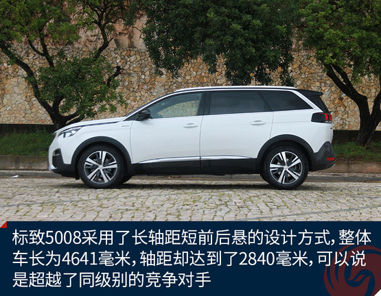 和市面上的一些7座SUV不同,標(biāo)致5008采用了長軸距短前后懸的設(shè)計方式,這樣的設(shè)計更多的出現(xiàn)在運動派車型上。標(biāo)致5008的整體車長為4641毫米,軸距卻達(dá)到了2840毫米,可以說是超越了同級別的競爭對手。