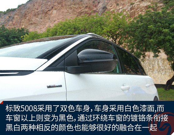 標(biāo)致5008采用了雙色車身,比如我們試駕的這一輛GT-Line版車型,車身整體采用白色漆面,而車窗以上的部分則變?yōu)楹谏ㄟ^環(huán)繞車窗的鍍鉻條銜接,黑白兩種相反的顏色也能夠很好的融合在一起。