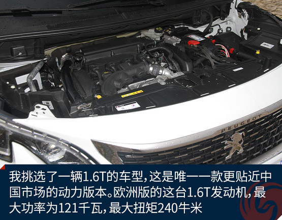 所以我挑選了一輛1.6T的車型,這是唯一一款更貼近中國市場的動力版本。歐洲版的這臺1.6T發(fā)動機,最大功率為121千瓦,最大扭矩240牛米,大概相當(dāng)于國內(nèi)標(biāo)致4008 1.6T的350THP版本。
