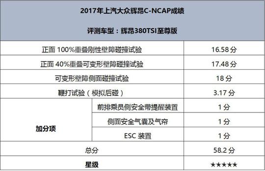 ????????輝昂成為“國家名片”,出色的安全性能同樣至關重要。在2017年度C-NCAP第一批車型的評價結果中,輝昂獲得58.2的高分,是C-NCAP 2015年版規則實施以來的最高分。