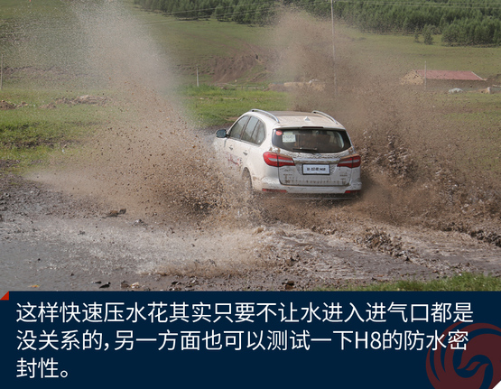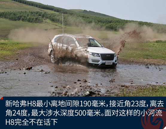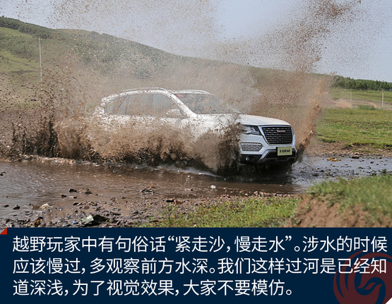 ????????涉水測試對于新哈弗H8來說簡直是小菜一碟,190mm的離地間隙,500mm的最大涉水高度,這條小河完全阻擋不了H8的腳步。俗話說“緊走沙,慢走水”是對于路況不清楚的水域,萬一進氣系統進水,發動機就會熄火。所以一定要小心涉水深度。像我們這么莽撞的壓水花,是在水域已經探明的情況下。