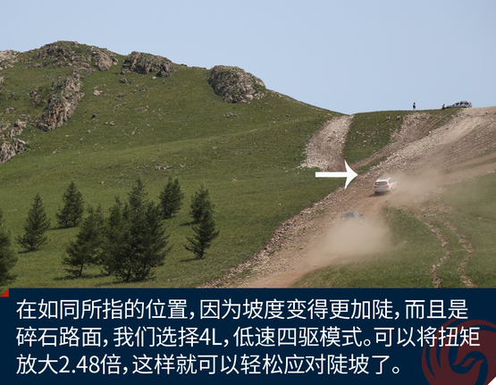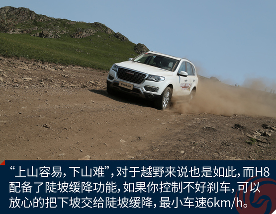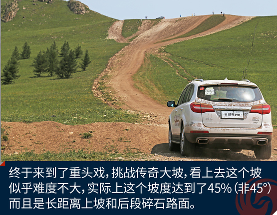 ????????經過刺激的涉水越野,我們終于來到了此行最難的挑戰地,傳奇大坡。這條上山的土路從圖片上看起來不陡,實際上已經達到了45%的坡度。人爬起來都氣喘吁吁。而且難度大的原因是兩點,一個是超長距離的大上坡,另一個是后端是碎石路面。你想靠沖坡根本行不通,如果動力不足最終是無法登頂的。H8不僅動力充沛而且有4L,低速四驅模式,而且博格華納雙速TOD可以隨時分配動力傳遞到前后軸,保障了有抓地力的輪胎有驅動力。