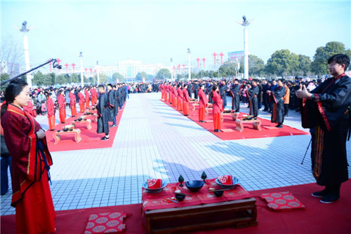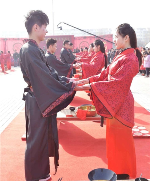 記者在現場看到,16對新人在司儀的引導下,采用中國古典婚禮儀式,有牽紅線、結發、拜天地等程序,儀式簡單而隆重,新人家屬、1000多名市民圍觀見證了新人喜結連理。