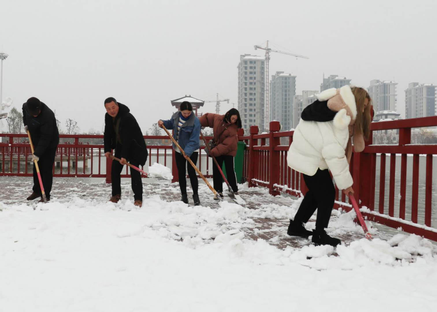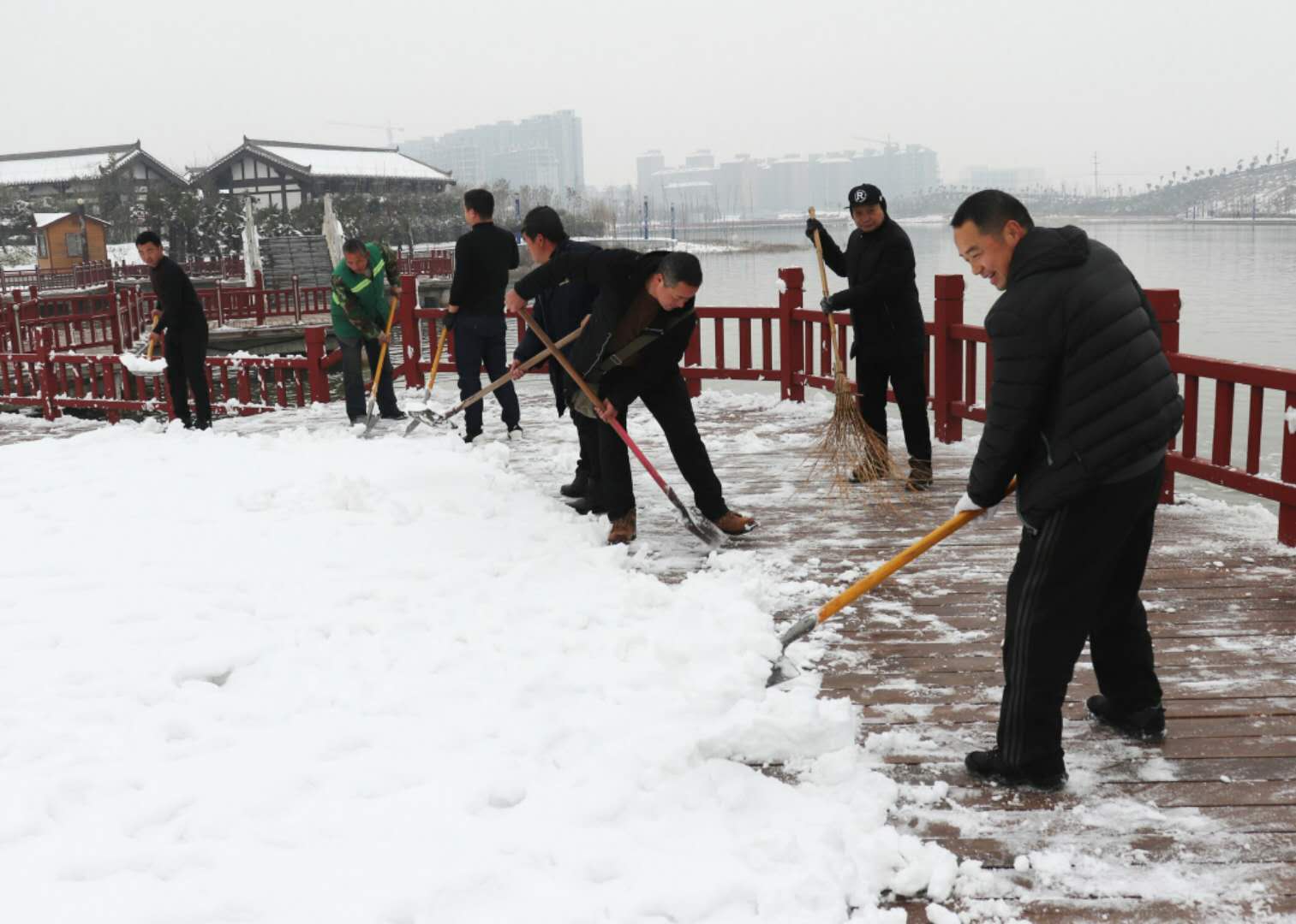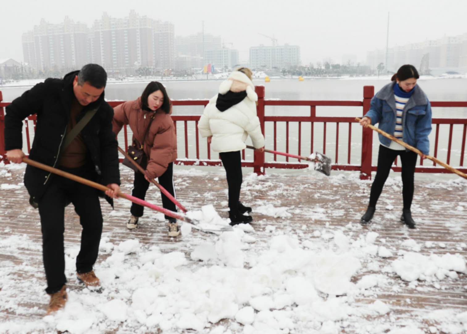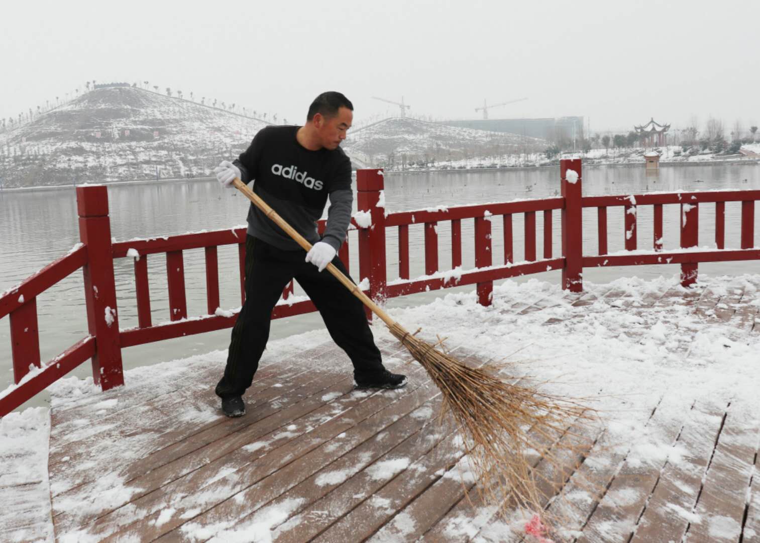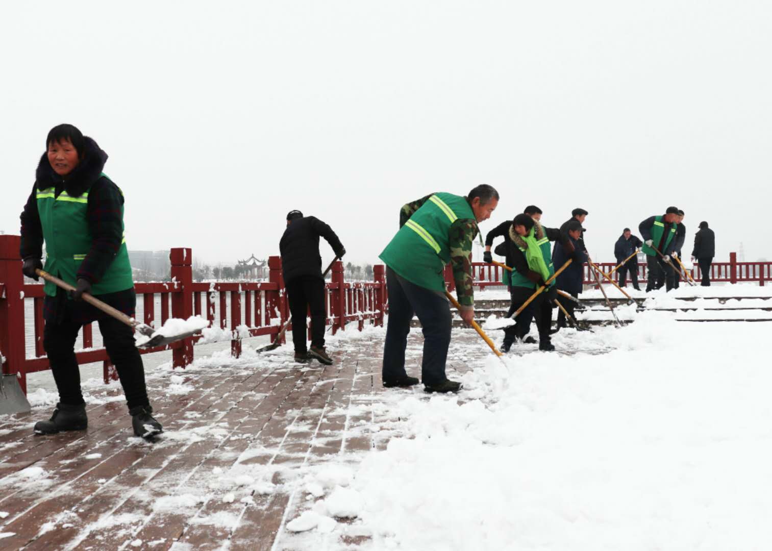截止到下午5時,還有職工和志愿者在公園里清理冰雪,市政園林中心副主任李紅衛帶領職工堅守崗位,形成一道靚麗的風景線。鹿邑縣市政園林中心主任劉克一說:“群眾滿意開心游玩,我們累點應該的,志愿者的義務清掃讓我們和游客深受感動!”