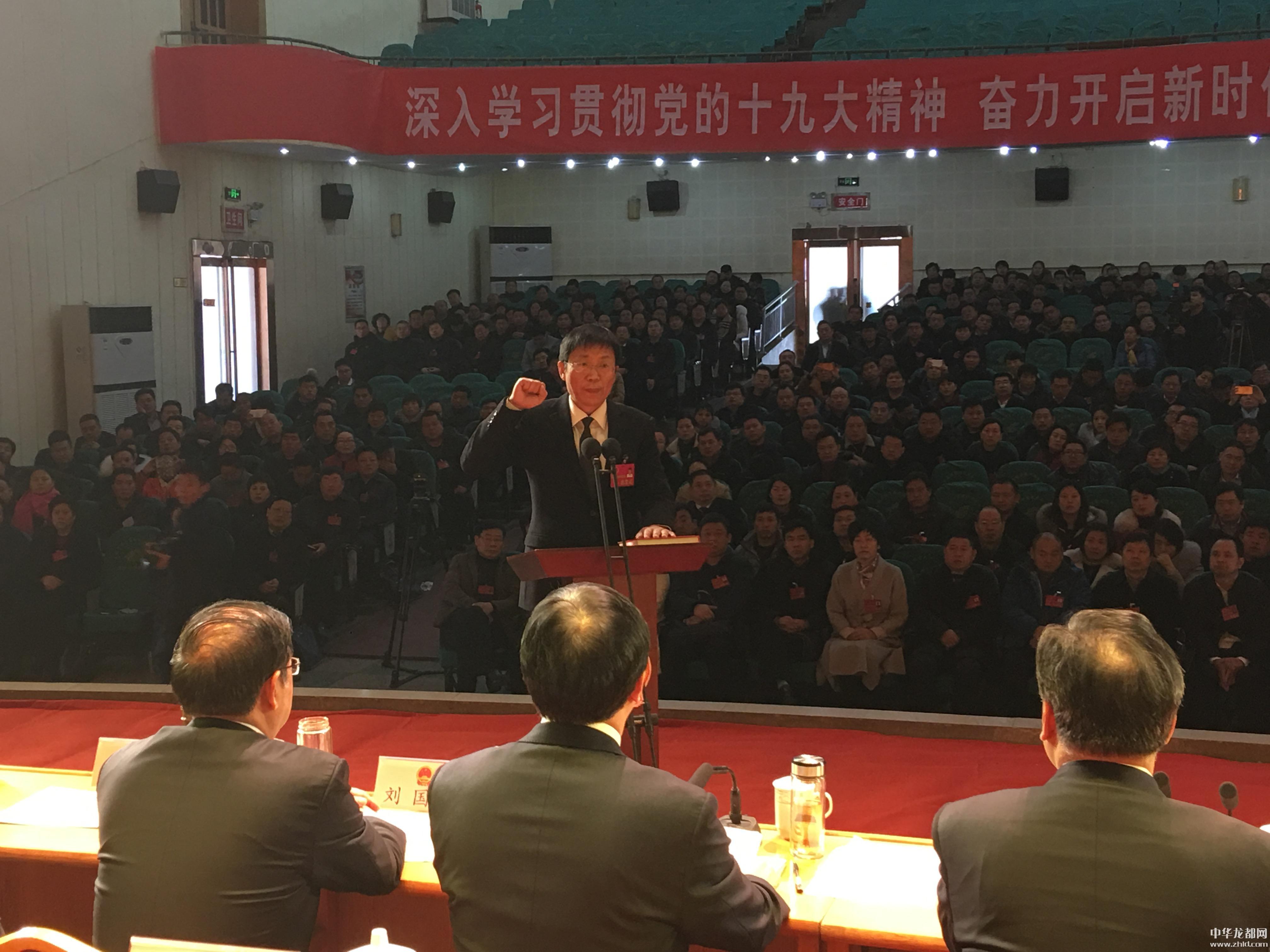 “我宣誓:忠于中華人民共和國憲法,維護憲法權(quán)威,履行法定職責,忠于祖國、忠于人民,恪盡職守、廉潔奉公,接受人民監(jiān)督,為建設(shè)富強、民主、文明、和諧的社會主義國家努力奮斗!”劉孟連左手撫按《憲法》,右手握拳高舉,莊嚴宣誓。全體代表監(jiān)誓。