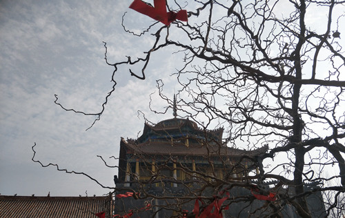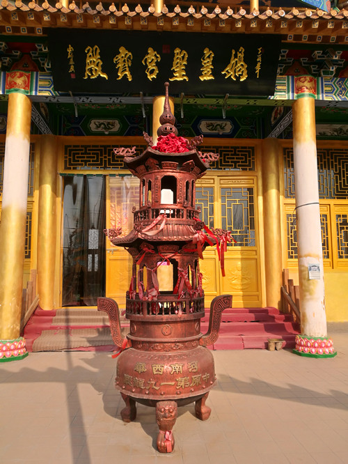 站在昆山女媧宮前向南看,一座高大宏偉的建筑物映入記者眼簾,由于它坐北朝南,我們只能看到它的背影。趙俊明告訴我們,那棟建筑物也是一座敬奉女媧娘娘的大殿,叫做媧皇圣宮寶殿。它是由一位女香客自發捐資修建的,這座氣派的大殿從無到有、從小到大整整用了14年時間,花費近千萬元。