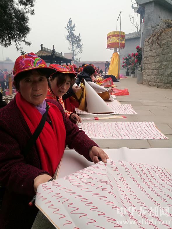 大霧的確延緩了香客的腳步,這也讓晚來的記者得以看到祭拜的盛景。女媧陵前,十幾名身著統(tǒng)一緞面紅襖,穿黑棉布鞋的女客正在結(jié)伴焚香祭拜,口音明顯和當(dāng)?shù)厝瞬煌K齻兪菑木辔魅A300多公里的濮陽范縣、臺前縣來的,說是凌晨2時(shí)就起身出發(fā),大霧中不僅遭遇堵車,還迷了路,到女媧城都快8時(shí)了。她們這次一起來的有30多人,分乘4輛車。就像往常前來一樣,她們在女媧城要焚香、跪拜、“寫賬”(在紙上畫符,敬奉女媧的一種民間形式)、“守功”(在大殿靜坐,以示對女媧親近),直至下午方回。“我們每年六月初一和臘月初一都來,為啥?信奉女媧娘娘唄,不來不舒服。”其中一位孔姓香客告訴記者。