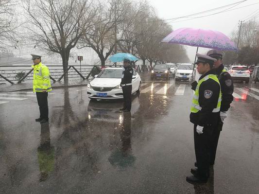按照會議的統一安排部署,交警大隊城市中隊負責羲皇賓館門前、老看守所路口和商城東路的道路保障工作。執勤民警合理分配警力,清理引導路面亂停亂放車輛,合理分流駛入車輛,規范指揮路口交通,他們克服寒冷下雨惡劣天氣,充分發揚不怕苦不怕累的精神。在雨中一刻不停的忙碌著,中隊長閆本志的微信運動的步數達到30000多步,成功登頂榜首,交警隊員李炯等帽子淋濕了,衣服淋濕了,鞋子也進水了,他們顧不了這些,一絲不茍的工作。他們的辛苦付出感動了過往司機和行人,一位女士下車送來雨傘,被執勤交警婉拒了,后邊的過路行人直接打開車窗為過交警扔下雨傘而去。一會功夫,執勤的路口多了各種色彩的花雨傘,在雨中游走,像綻放的太陽花,裝扮了雨中的淮陽。
