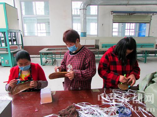 卞路口鄉高山店村的一家鞋廠,留守婦女正在加工鞋底。該縣在扶貧攻堅中,通過實施資金幫扶、技術培訓等措施幫助貧困群眾、返鄉農民工創辦玩具廠、制鞋廠等微型企業,為周邊群眾提供了就業崗位。