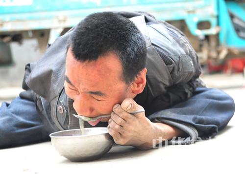 媽媽乘上一碗放在地上,紅印坐在墊子上,用腳夾著勺子,彎下腰來吃得很香。看到紅印吃飯那么費(fèi)力,在場人心里酸酸的,為紅印自強(qiáng)不息所打動(dòng)著??墒钱?dāng)初娘倆可沒少流眼淚,李新蘭發(fā)現(xiàn)兒子兩只腳是靈活完好的,就開始訓(xùn)練他用腳吃飯、洗臉。養(yǎng)大一個(gè)正常的孩子尚且不易,何況是張紅印這樣的孩子?李新蘭一遍遍地教,年幼的張紅印一遍遍地學(xué)。難為到受不了時(shí),娘倆就抱在一起哭。
