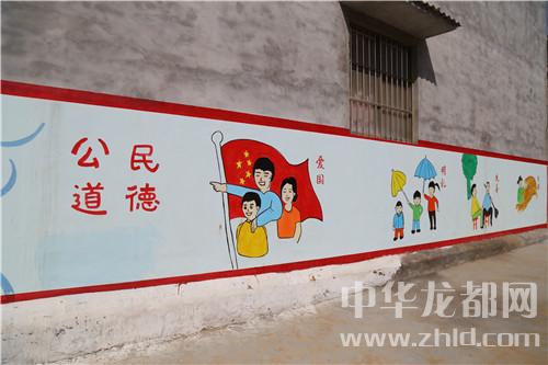 當日16時許,記者在該村看到,干凈整潔的水泥路像玉帶在村中盤旋,街道兩側栽植不久的小樹在向人們招手,坑塘四周干凈整潔,綠樹環繞,塘水清澈,梳理有致,房前屋后干凈整潔……天空中雖然下著雨,但是記者遠遠的就聽到了群眾的談笑聲和機械的轟鳴聲,走近,原來是村民們不顧天氣下雨,依然在自發地進行道路清理工作。記者看到,該村墻體文化更讓村子增加了很多的“內涵”。