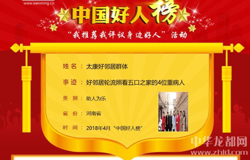 中華龍都網訊(周口報業全媒體記者 馬治衛)4月28日上午,4月中國好人榜發布儀式暨全國道德模范與身邊好人現場交流活動在天津市和平區舉行。太康縣“好鄰居群體”榮登4月份中國好人榜。