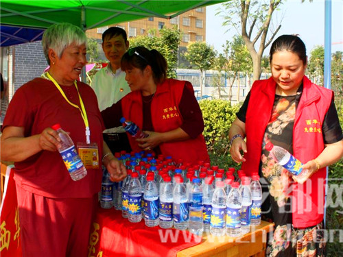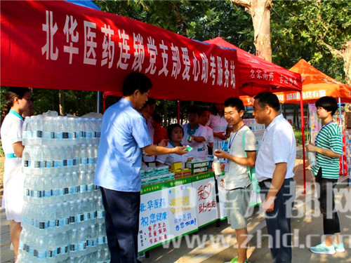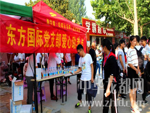 愛心助考活動現(xiàn)場,西華縣真愛醫(yī)院黨支部設立的“黨旗引領、護航高考”的大紅愛心助考條幅分外惹眼,黨員志愿者們免費為考生提供藿香正氣水、風油精、退燒藥等,并有醫(yī)護人員現(xiàn)場提供急救服務。在西華縣恒生醫(yī)院黨支部愛心助考點前,3名醫(yī)護人員正在免費為考生及家長提供風油精、清涼油、仁丹、藿香正氣水等防暑降溫藥品和急救藥品,還有擔架、120急救車輛等。西華縣北華醫(yī)藥黨支部愛心助考服務站的黨員志愿者,正在向考生免費提供防暑降溫藥、感冒發(fā)燒藥、拉肚子藥等藥品。黨員志愿者愛心企業(yè)代表宋女士說:“在高考期間,我們?yōu)榭忌凹议L免費提供礦泉水、芭蕉扇、清涼油等多項服務,除了愛心,更多的是一份責任和使命。”