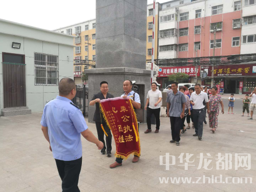 中華龍都網訊 (周口報業全媒體記者 陳永團 通訊員 智艷威 戚娟娟)7月12日上午,家住商水縣巴村鎮的九名村民,將一面標著“秉公執法,心系百姓”的錦旗送到商水縣人民法院執行局,以感謝庭長苑慶宏在執行中公正高效的司法行為,并對其在執行案件中情系百姓的工作態度給予高度贊揚。