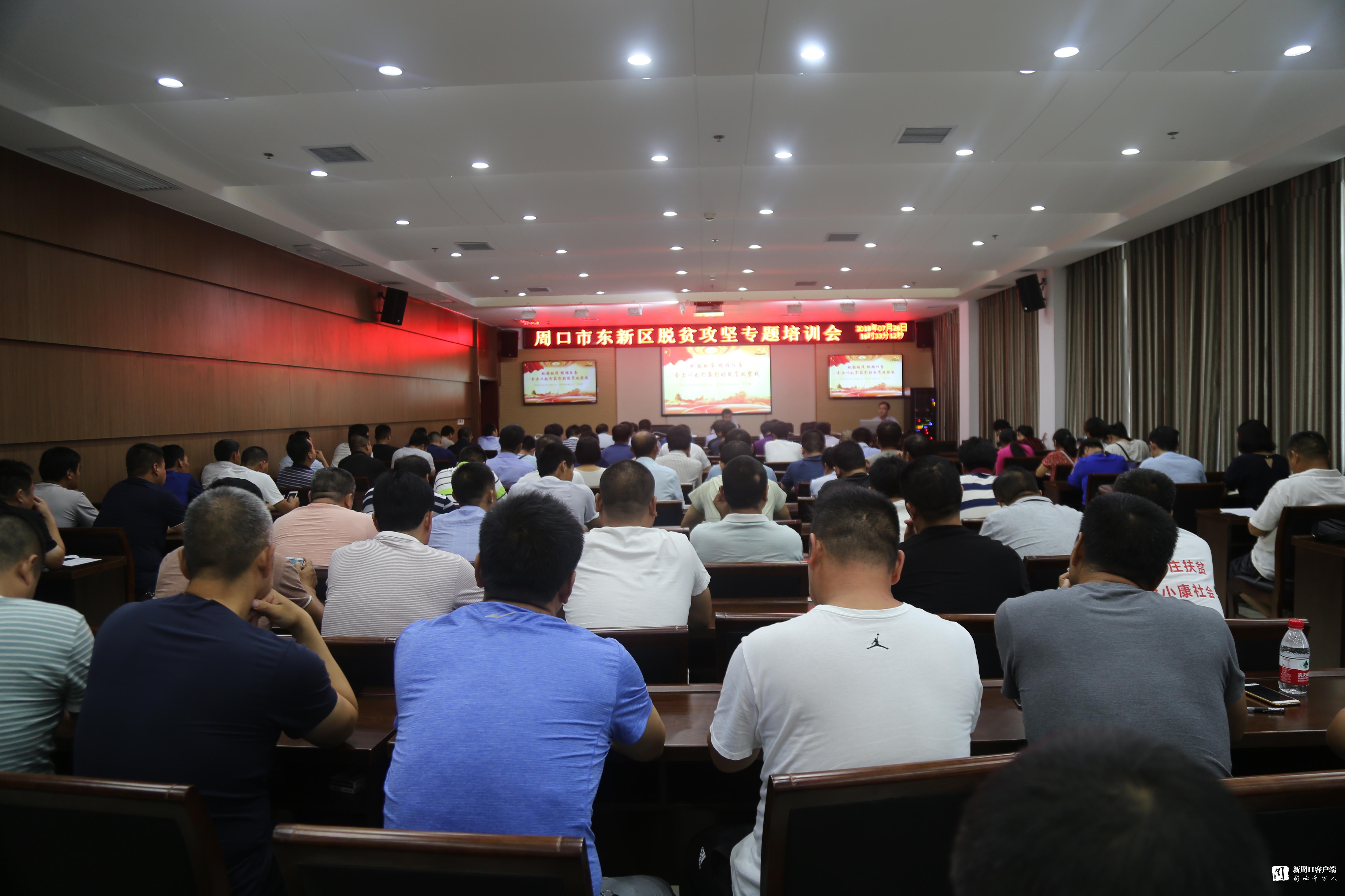 周口日報·新周口客戶端記者 張勁松 通訊員 蘇千 王玉鳳 文/圖 7月26日下午,東新區召開全區脫貧攻堅專題培訓會,管委會副主任李湛主持會議,各鄉(辦)和區直單位相關負責人,全區49個行政村責任組組長、支部書記、村主任、黨建聯系人,9個重點村第一書記及區扶貧辦相關人員共計300余人參加會議。
