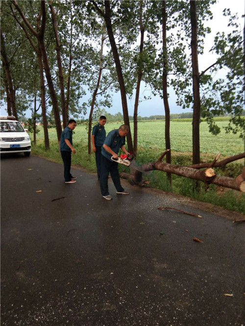 在東夏看張立交橋、李莊橋處,多棵行道樹被大風刮倒,大量枝掉落在公路上,嚴重危及行車安全和道路通行,執法人員立即冒雨采取安全防護措施,并利用車載應急搶險工具將倒塌在公路上直徑為10-20cm的樹木進行及時清理,并對殘枝落葉進行了全面清掃。歷時三個小時,及時地消除了道路安全隱患,保障人民群眾的出行安全。