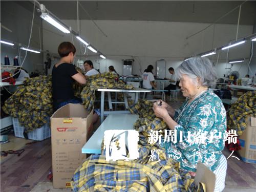 8月12日,在沈丘縣周營鎮歐營村一家服飾有限公司,當地的留守婦女正在加工訂單服裝。