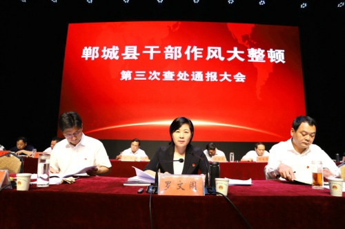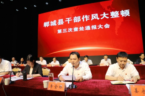 8月15日下午,鄲城縣召開干部作風大整頓第三次查處通報大會。貫徹全市干部作風大整頓查處通報會議精神和縣委十二屆四次全會暨縣委工作會議精神,通報典型案例,宣布處理決定,傳導工作壓力,夯實工作責任,為進一步推進各項工作任務落實、打好打贏脫貧攻堅戰提供堅強有力的作風保障。縣委書記羅文閣發表講話,縣長李全林主持。全縣副處級以上領導干部和縣、鄉、村各級各部門負責人參會。