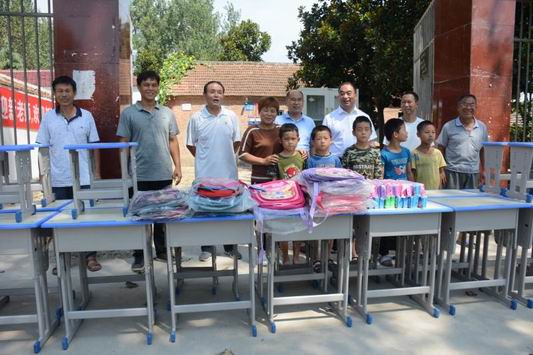 8月27日上午11時許,商水縣平店鄉大朱莊村小學大 門外,突然停放一輛廂式貨車。看到有單位送來了“開學禮”,學校老師和學生滿臉興奮 、七手八腳和來人一塊卸下一些嶄新的課桌凳、書包文具等學習辦公用品。