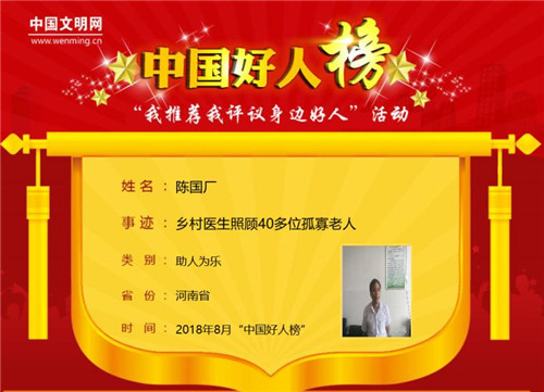 太康縣鄉(xiāng)村醫(yī)生陳國(guó)廠投資600萬元建醫(yī)養(yǎng)院捐給國(guó)家,義務(wù)照顧40多位孤寡老人義舉引起社會(huì)各界廣泛關(guān)注。8月31日,中國(guó)文明網(wǎng)公布消息:陳國(guó)廠光榮入選8月份“助人為樂”類“中國(guó)好人榜”。截至目前,該縣入選“中國(guó)好人榜”已達(dá)40名。