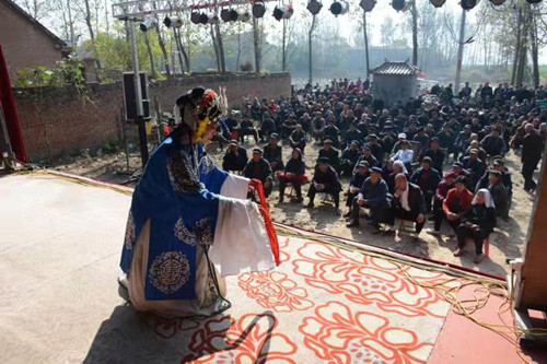 11月3日上午,記者在平店鄉吳吉屯村看到,剛剛落成的村室門前搭建了一個大舞臺,洛陽市的一家豫劇團正在表演精彩的古裝戲曲,舞臺前坐滿了村民(如圖)。