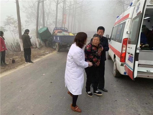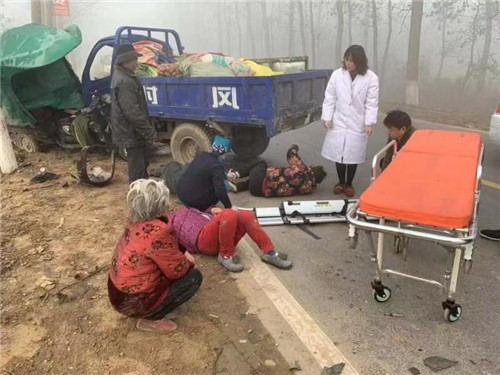 行至不遠處,他們隱約發現前方有障礙物,并聽到有人呼救。王和平和同事立即下車走進一看,只見一輛農用三輪車和一輛電動三輪車相撞,電動三輪車被撞到路邊一顆樹上,整個車身被撞傾斜,事故現場有 4人東倒西歪地躺在地上,傷情不明。